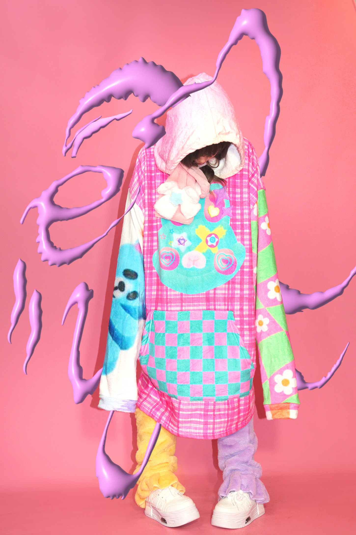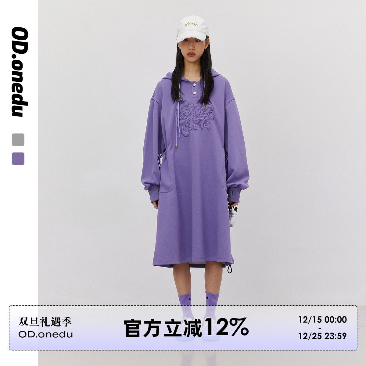 OD连帽卫衣裙女春款充棉绣指套中长款过膝紫色垂感宽松直筒连衣裙