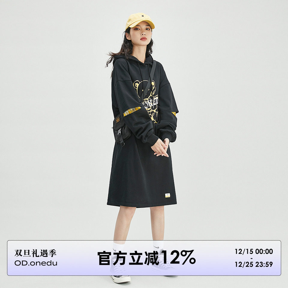 布景连衣裙女冬季新品简约连帽刺绣印花宽松长袖中长款卫衣裙1510