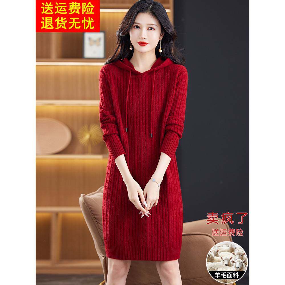 羊毛针织连帽卫衣连衣裙女秋冬中长款小个洋气打底外穿羊绒毛衣裙
