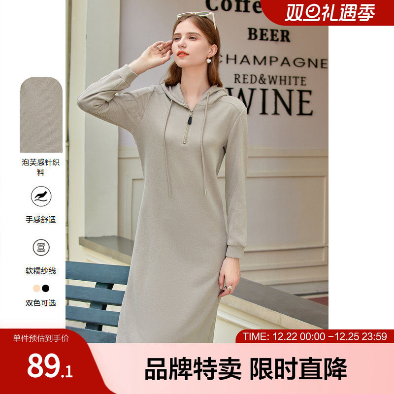 纳帕佳连帽卫衣连衣裙女2023秋冬新款黑色中长款套头长袖休闲裙子