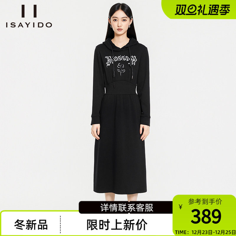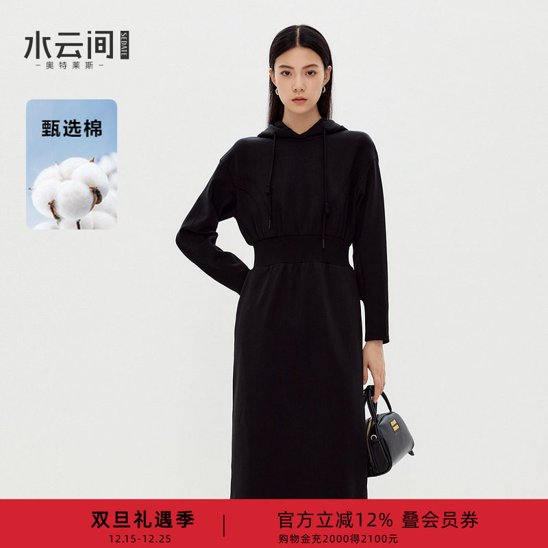 水云间黑色连帽卫衣连衣裙女中长款收腰裙子户外运动风2025秋冬款