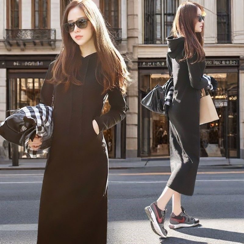 中长款连帽卫衣连衣裙女秋冬季新款修身显瘦黑色过膝加厚长袖裙子