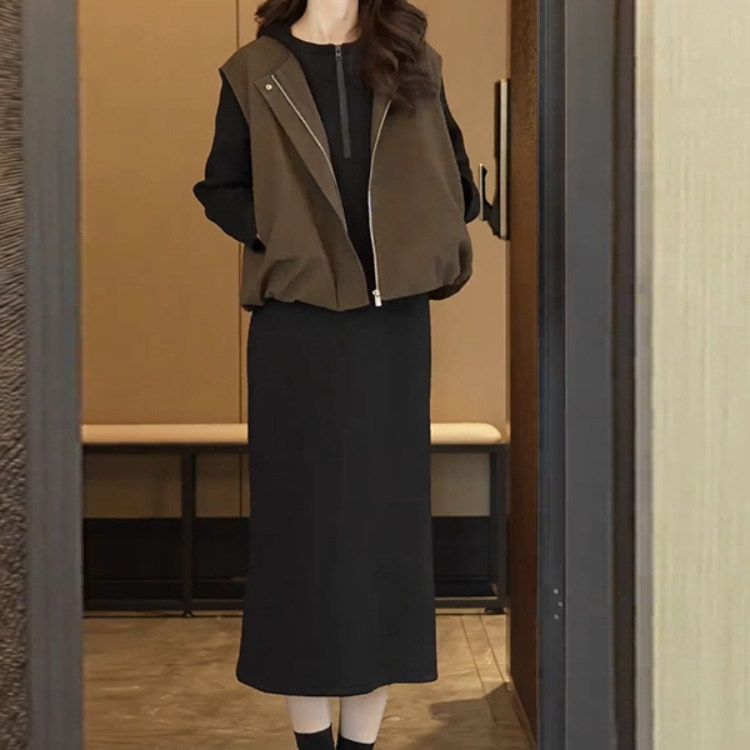 时尚连帽卫衣裙2025秋冬新款宽松半拉链中长款连衣裙无袖花苞马甲