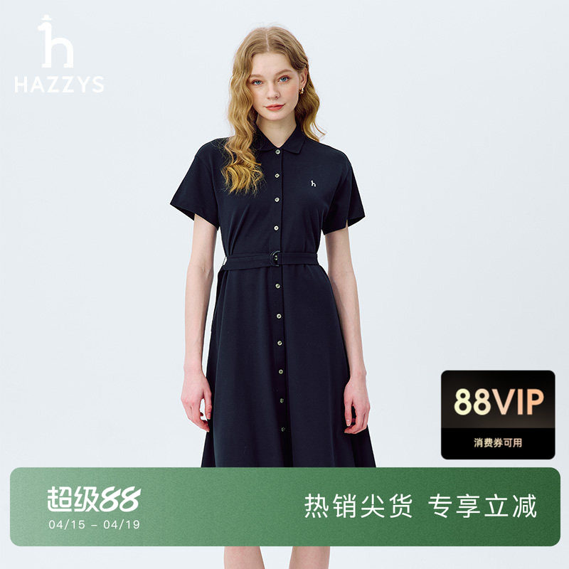 Hazzys哈吉斯休闲翻领短袖针织连衣裙女士春夏季时尚潮流通勤裙子