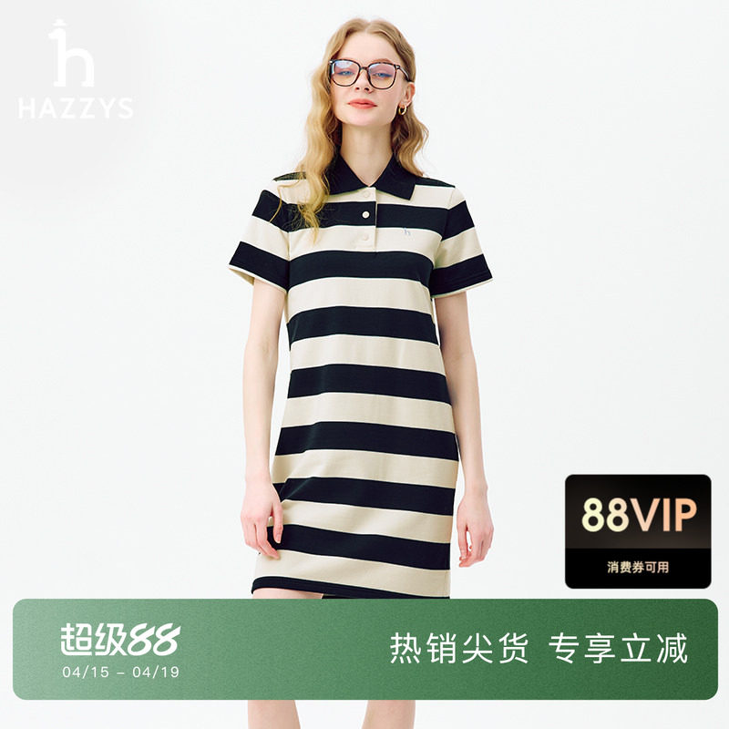 Hazzys哈吉斯条纹短袖连衣裙女士夏季宽松针织裙子休闲气质polo裙