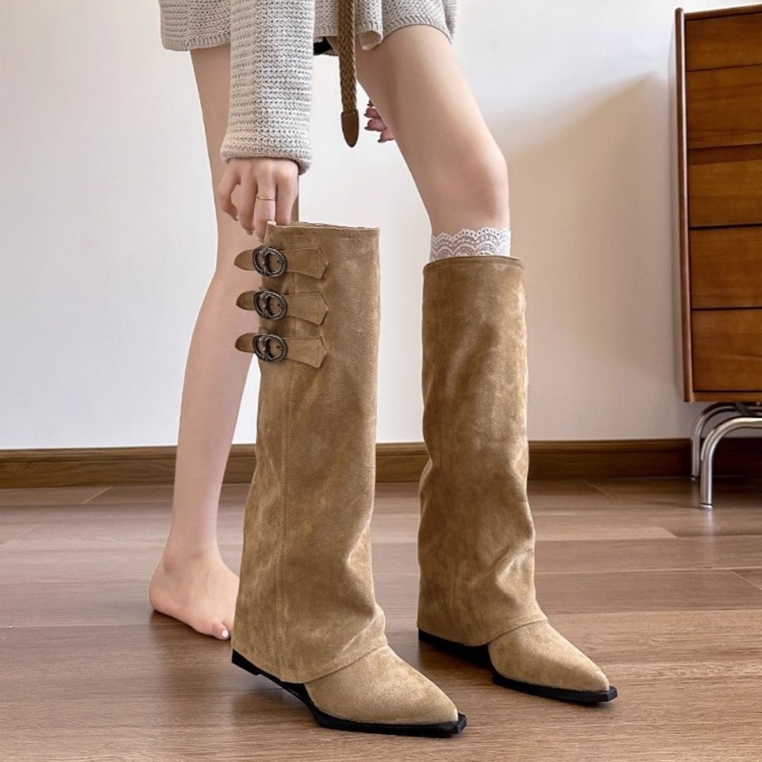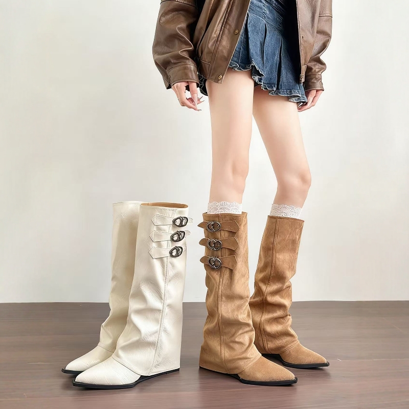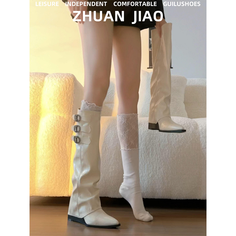 白色尖头内增高裤管靴女2025秋冬新款复古皮带扣长筒靴坡跟骑士靴