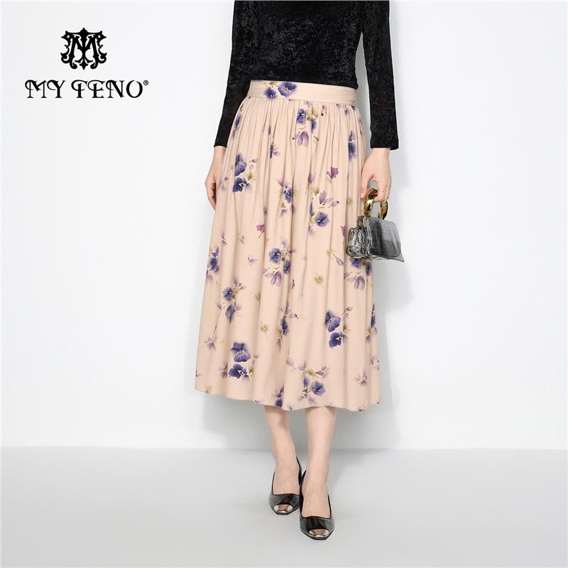马天奴2025夏季新款卡其印花雪纺半身裙半裙子系带长裙时尚百搭女