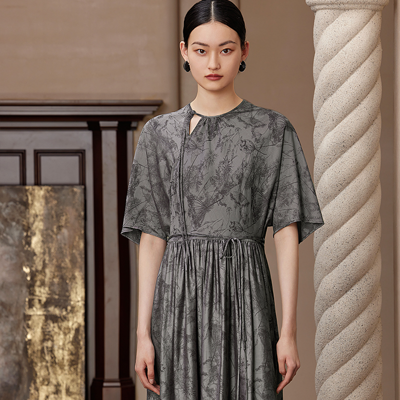 一丝牵 100%桑蚕丝香云纱花萝提花连衣裙真丝V领连袖收腰系带长裙