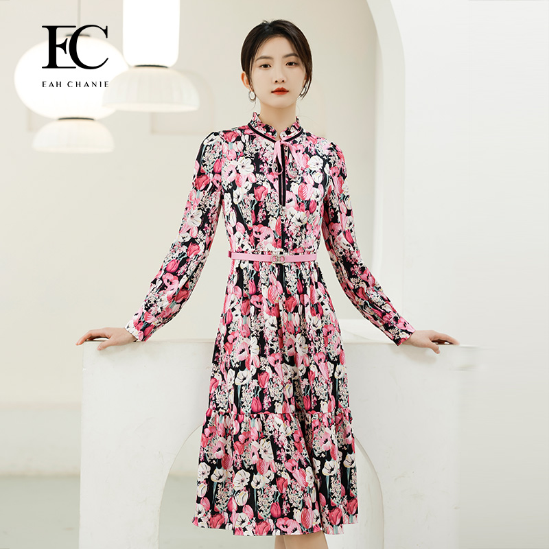 奕辰女装2025秋季新款花卉连衣裙法式浪漫印花系带长裙eahchanie