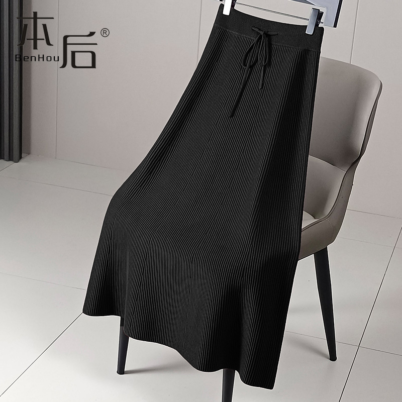 F1771 厚款高垂感显瘦抽条针织半身裙秋冬女a字裙水晶麻系带长裙