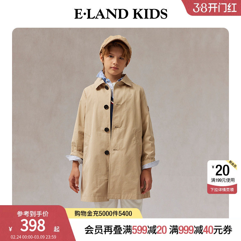 eland kids衣恋童装男童风衣春秋学院风徽章刺绣双插袋中长款外套