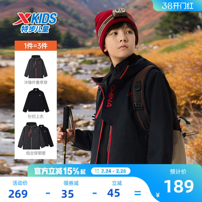 特步童装儿童外套2026冬季新款三合一风衣男童防风春秋摇粒绒上衣