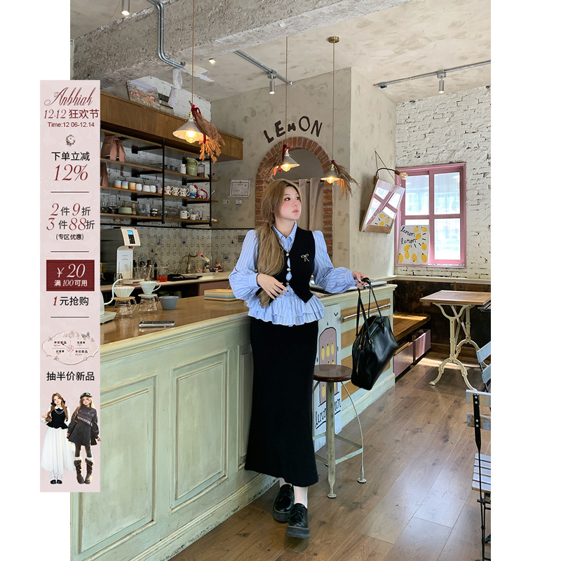 甜梨呆呆 昭和千奈 秋季三件套长袖打底衫上衣+抹胸+短裙套装女