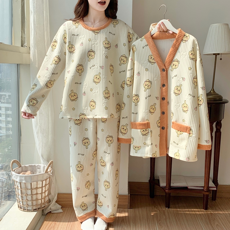 三件套装秋冬款超大码空气棉夹层少女生睡衣春秋季可爱卡通家居服