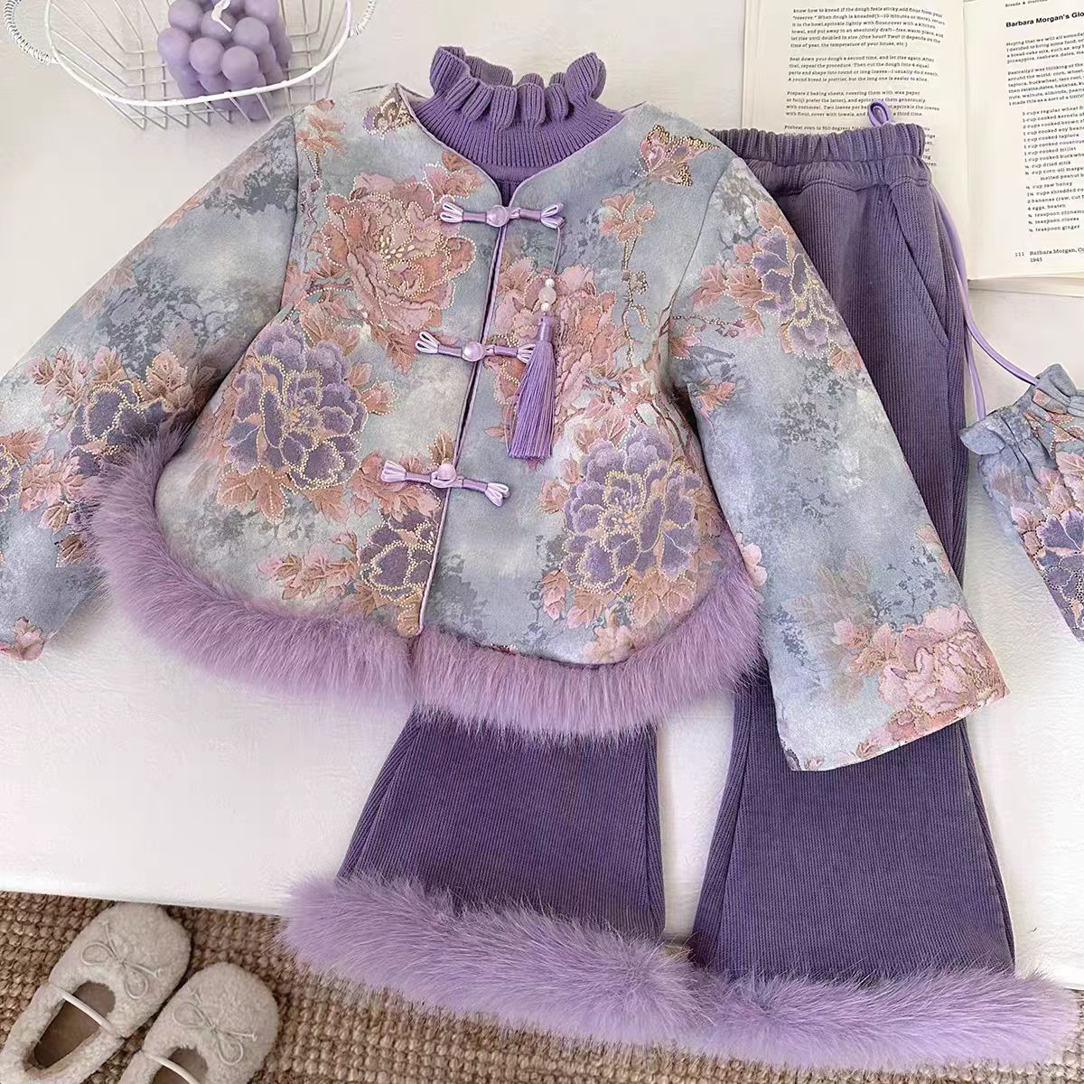 女童三件套加绒中国风秋冬装儿童两件套女宝宝新拜年服新中式套装