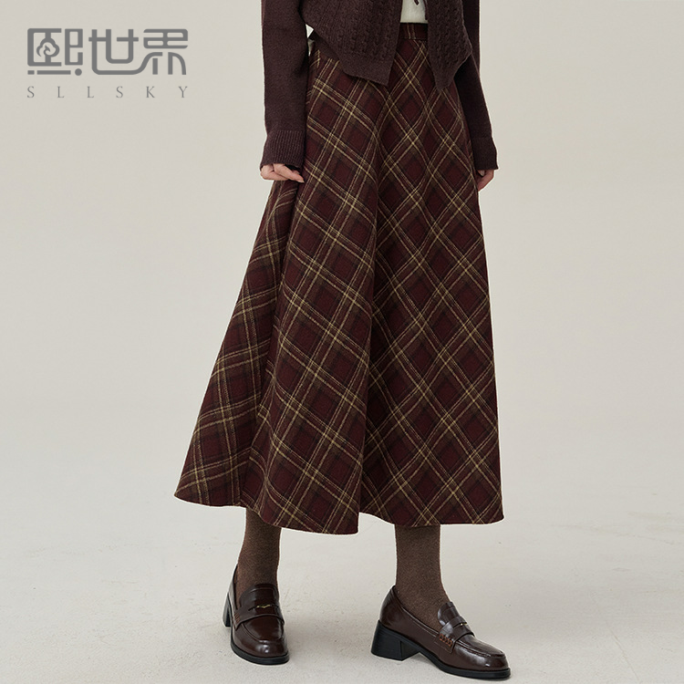 熙世界美式复古格纹毛呢半身裙女2025秋冬款梨形身材高腰a字伞裙