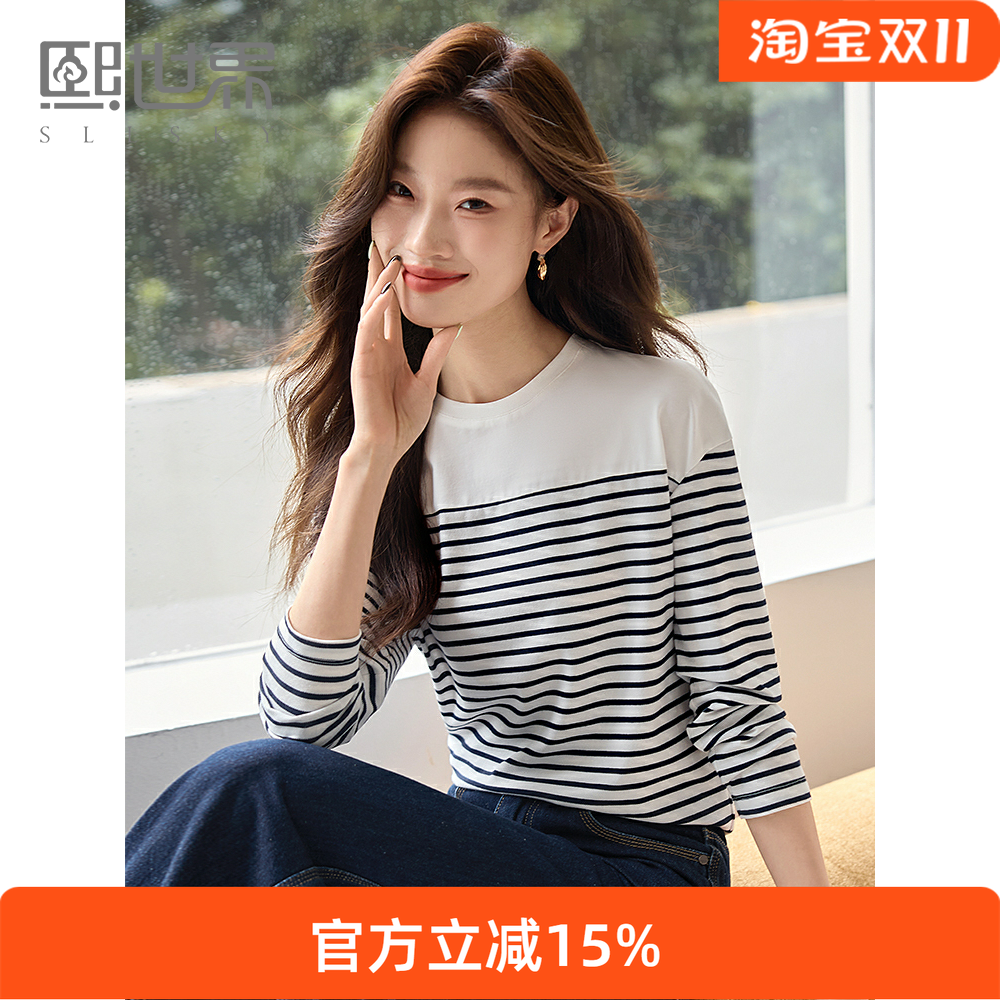 熙世界黑白经典条纹T恤女长袖2025秋季新款宽松洋气圆领打底衫