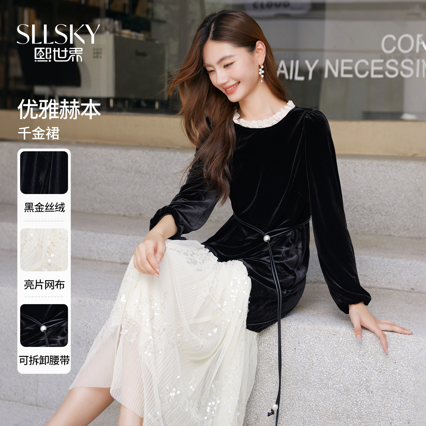 熙世界优雅赫本千金风亮片网纱拼接黑色丝绒连衣裙女2025秋冬新款
