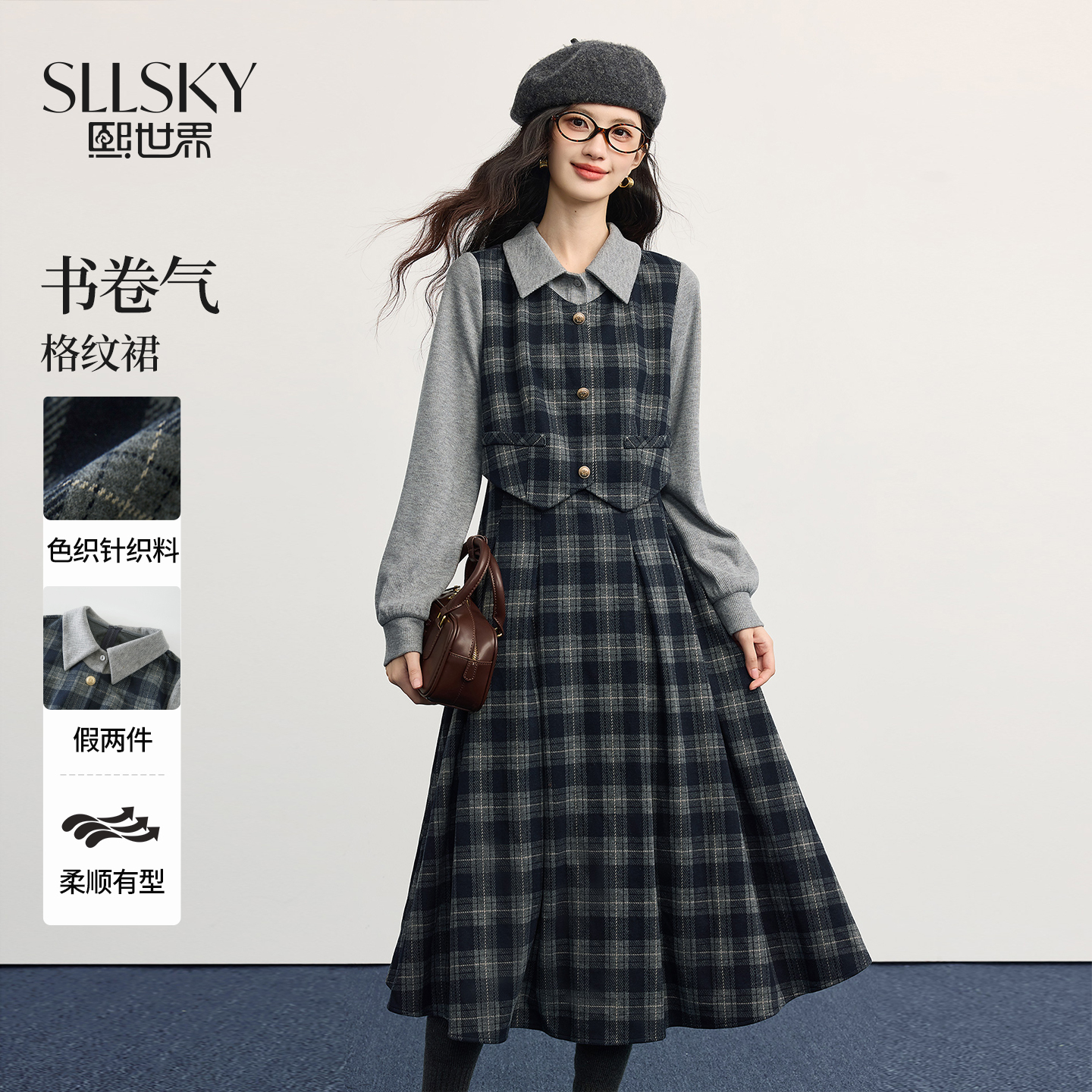 熙世界复古知识分子风针织拼接格纹毛呢假两件连衣裙女2025秋冬季