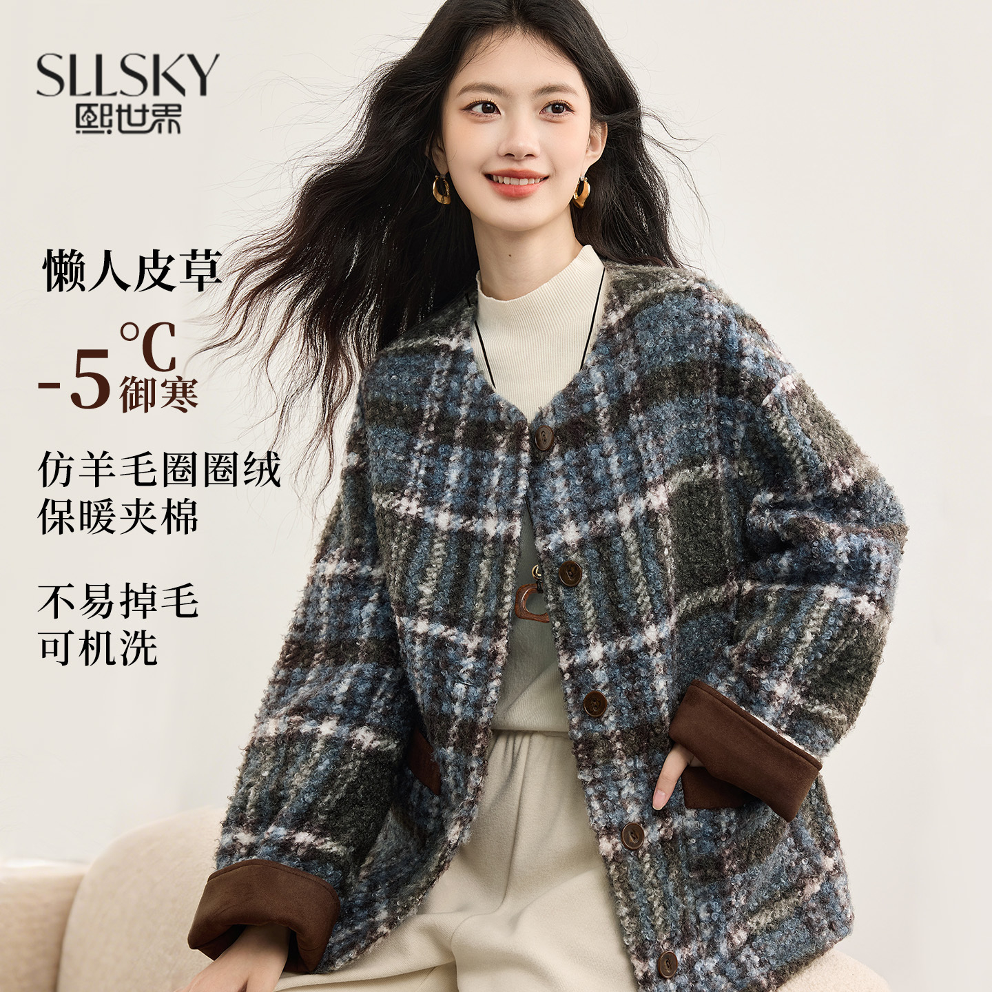 熙世界小香风格纹圈圈绒毛呢外套女短款夹棉呢子大衣2025冬装新款