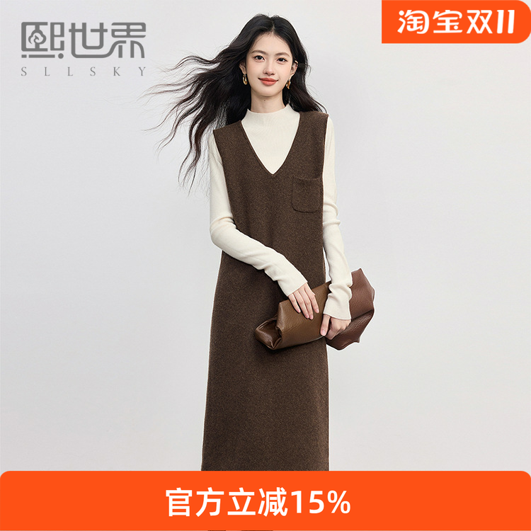 熙世界法式V领针织背心裙女2025秋冬新款宽松慵懒羊毛无袖连衣裙