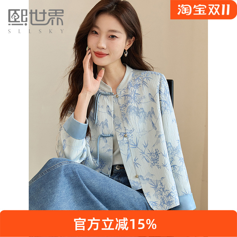 熙世界复古新中式花鸟提花短外套女2025秋装新款流苏盘扣国风上衣