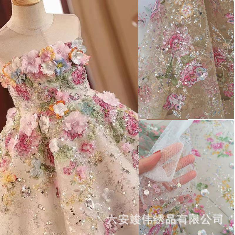 多色立体钉珠刺绣蕾丝面料布料婚纱礼服童装diy材料服装装饰辅料