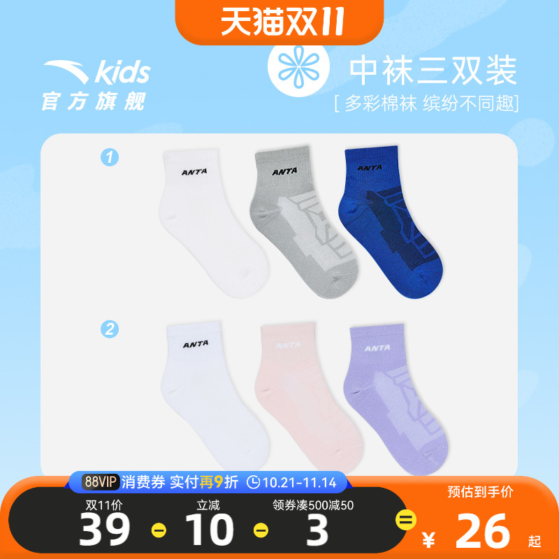 安踏儿童袜子男童跑步袜子女童袜子精梳棉运动三双装短袜子莫代尔