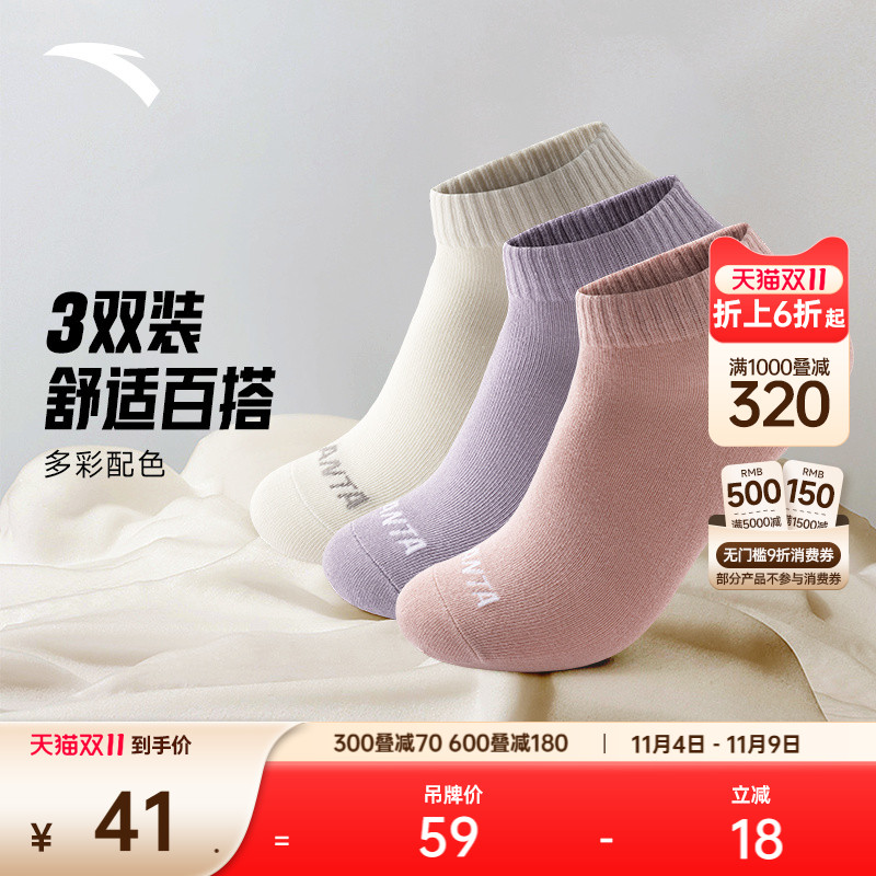 安踏运动袜3双装纯色女袜船袜跑步训练健身纯棉吸汗短袜短筒袜子