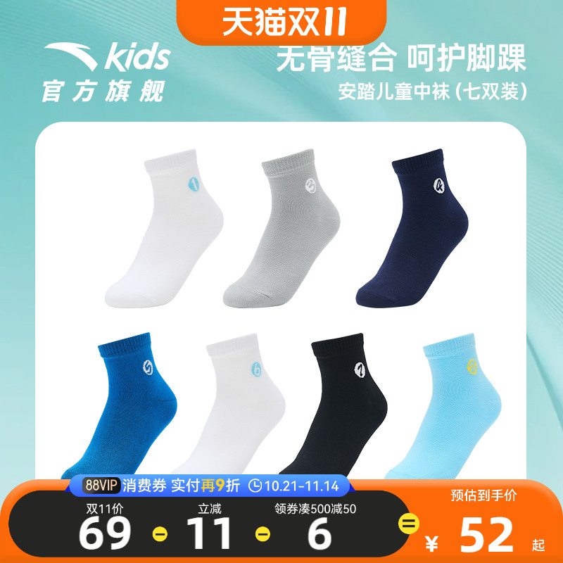 安踏儿童袜子秋款2025新精梳棉七双装短袜子男童运动跑步袜子女童