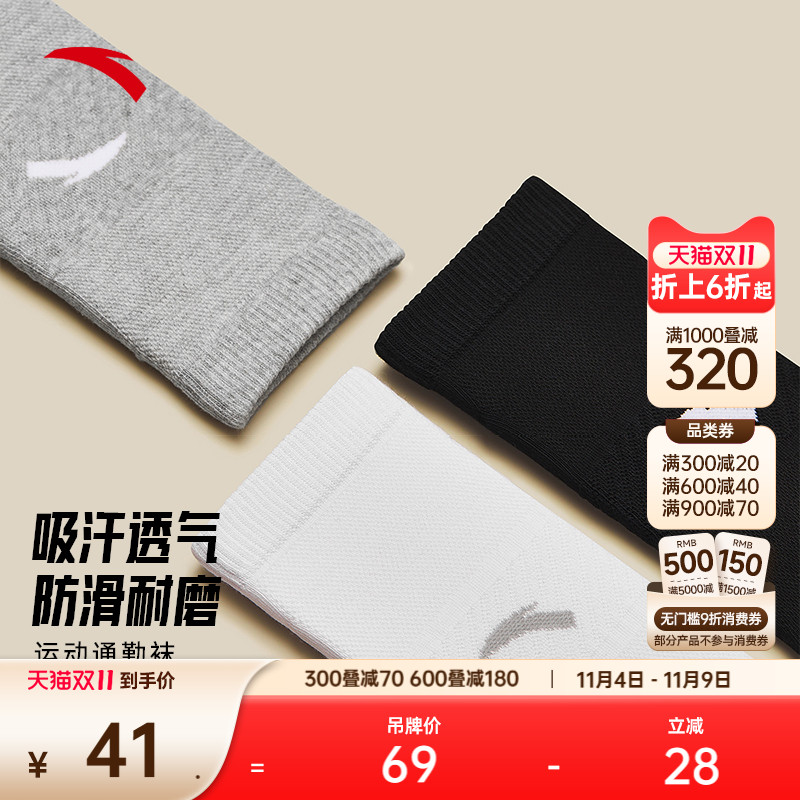 安踏运动袜三双装男女抗菌防臭吸汗棉质体测跑步登山短筒中筒袜子