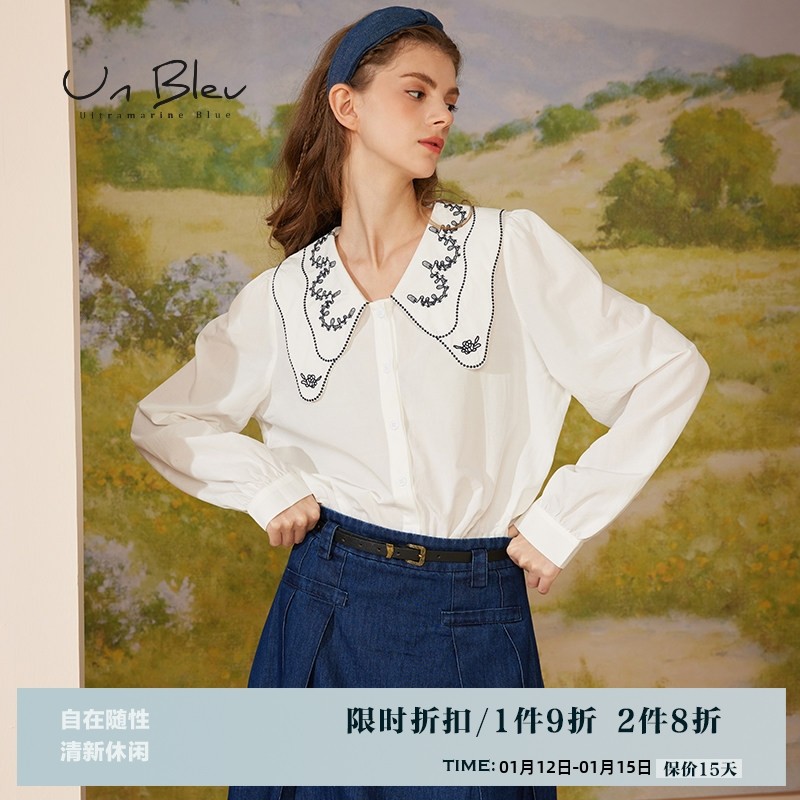 UnBleu白衬衫女宽松长袖秋装新款日系高级时尚女装绣花大翻领衬衣