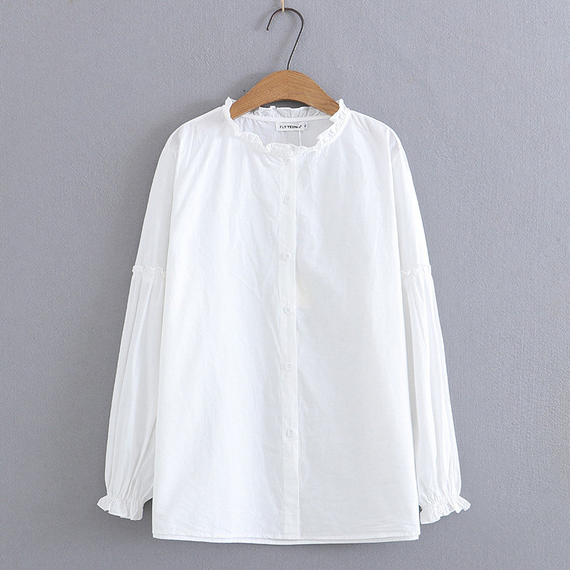 春秋韩版文艺小清新花边立领双层纱纯棉长袖白衬衫女宽松打底上衣