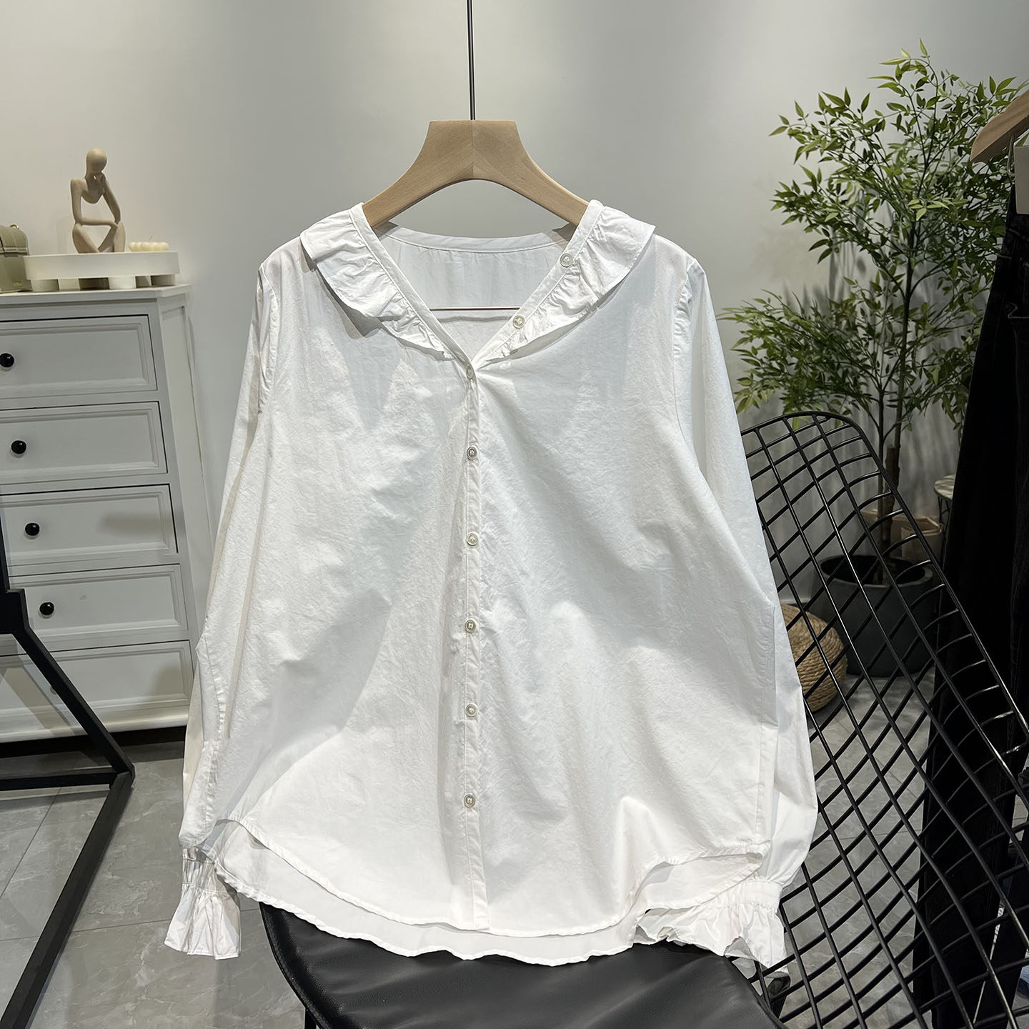 2026年春季新款时尚木耳边纯棉白衬衫女宽松休闲减龄长袖女上衣潮