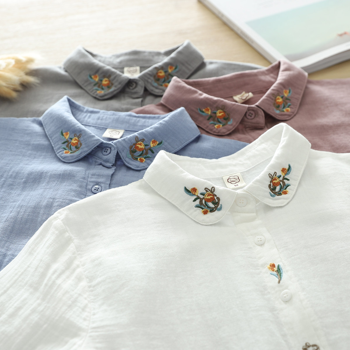 春装白色双层棉纱长袖白衬衫女宽松文艺百搭刺绣小花纯棉打底衬衣