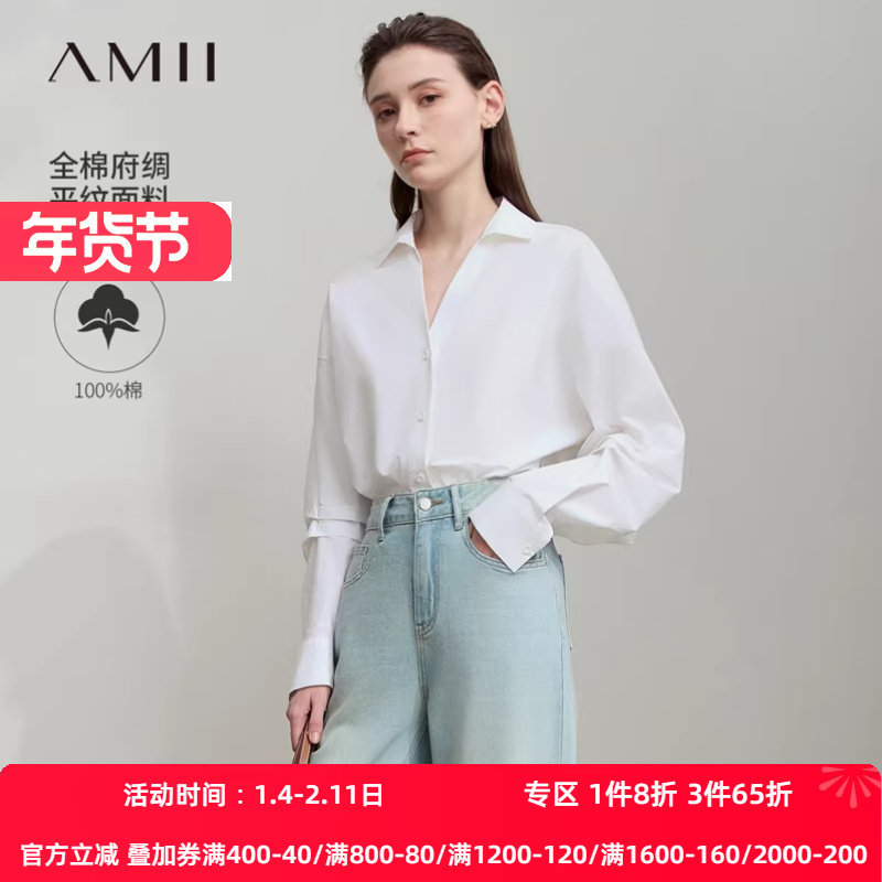 Amii2025秋新款通勤全棉翻领V领落肩袖收褶白衬衫女宽松衬衣上衣