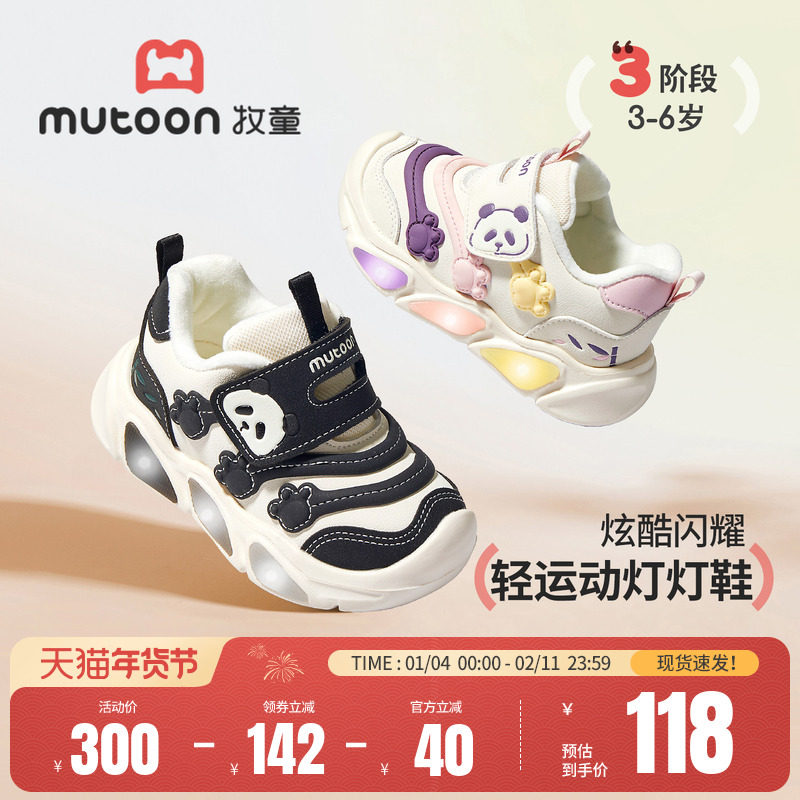 牧童童鞋男童运动鞋2025冬季新款儿童熊猫闪灯鞋加绒保暖女童棉鞋