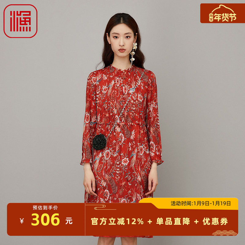 渔牌秋季新款女装印花长袖薄款过膝长款雪纺连衣裙子FGFC0008