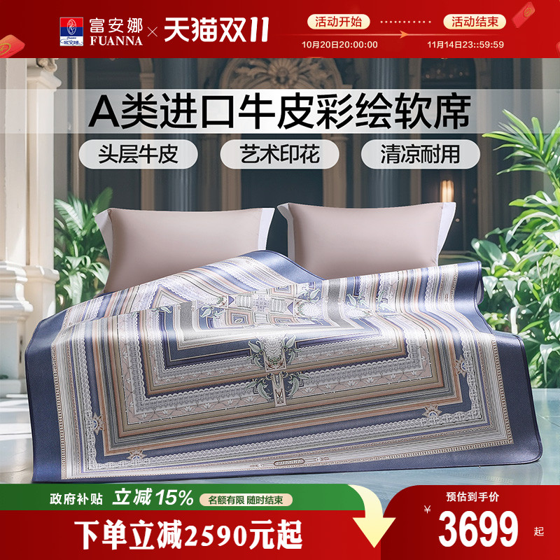 富安娜牛皮席A类进口头层牛皮软席高端平网彩绘凉席透气凉爽席子