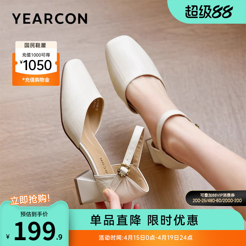 意尔康女鞋2026夏季单鞋真皮方头粗跟羊皮包头凉鞋外穿配裙子法式