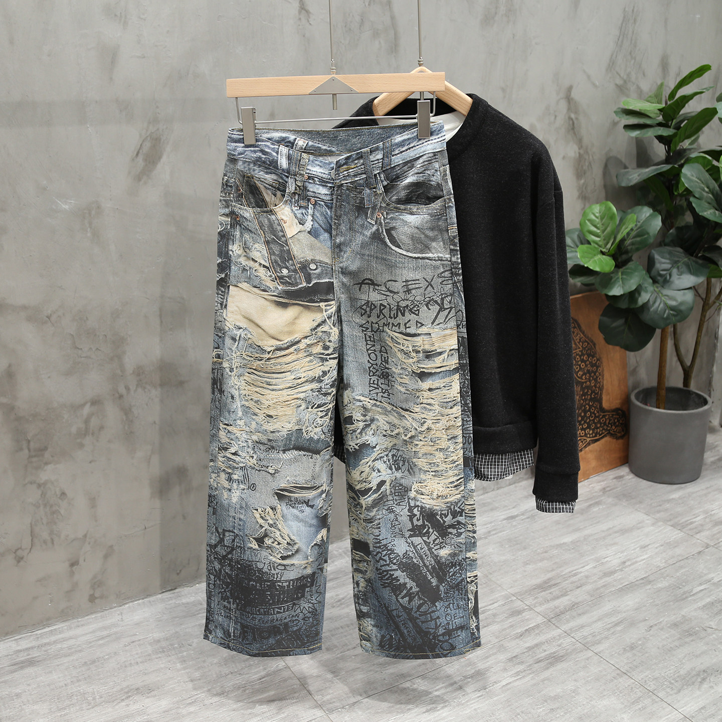 3D数码印花涂鸦高街嘻哈男女同款阔腿裤牛仔裤宽松痞帅拖地长裤子
