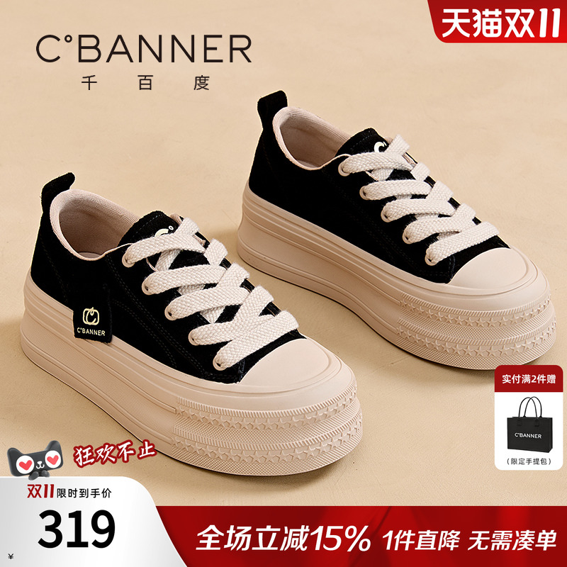 千百度女鞋秋季新款休闲鞋厚底单鞋帆布鞋复古棕色百搭运动板鞋女