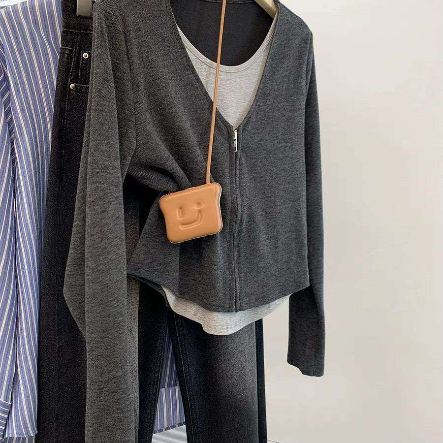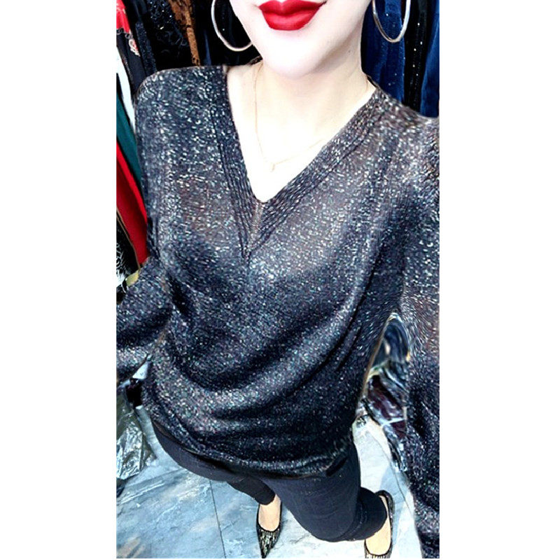 秋冬闪光丝V领长袖针织衫欧洲站宽松版长袖T恤女上衣大码百搭上衣