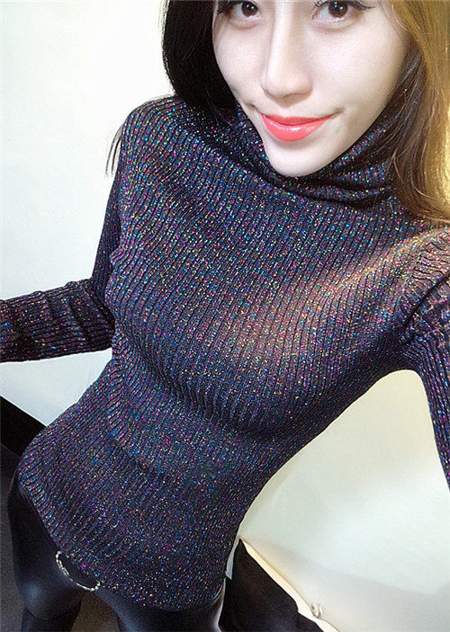 欧洲站秋冬新款欧货性感亮丝弹力高领长袖针织衫打底衫t恤女大码