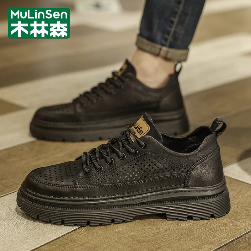 木林森皮鞋男款夏季透气镂空商务正装休闲英伦软底工装马丁鞋子男