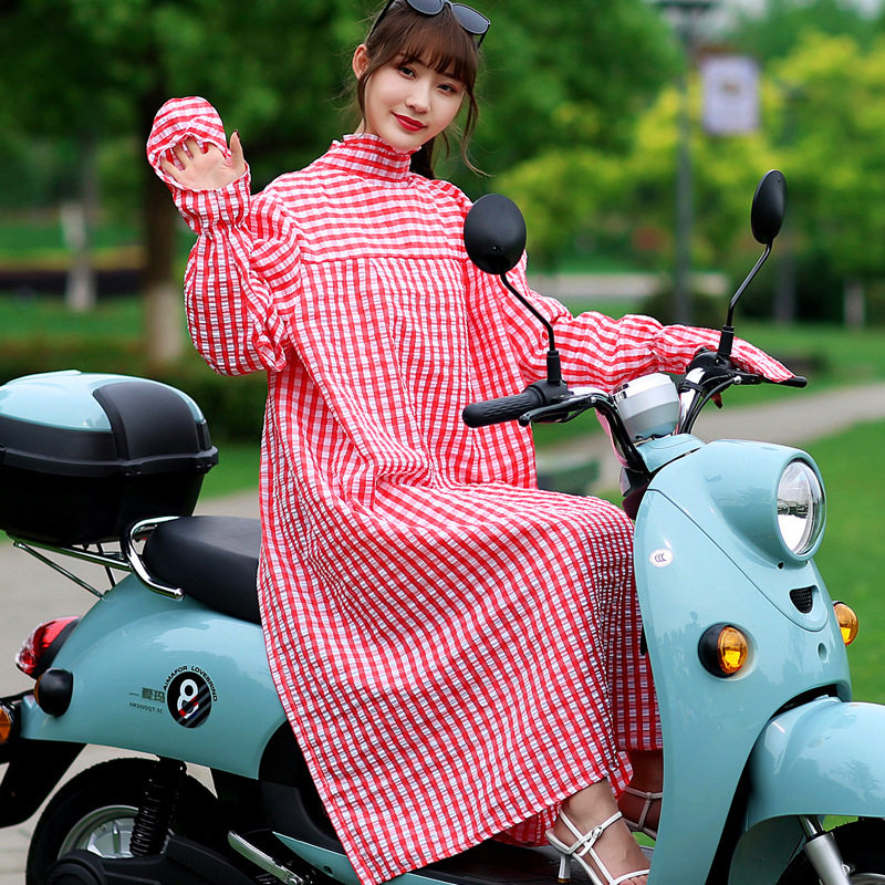 骑车电动车防晒衣服女加长款棉布格子衬衫电瓶摩托车全身开衫春夏