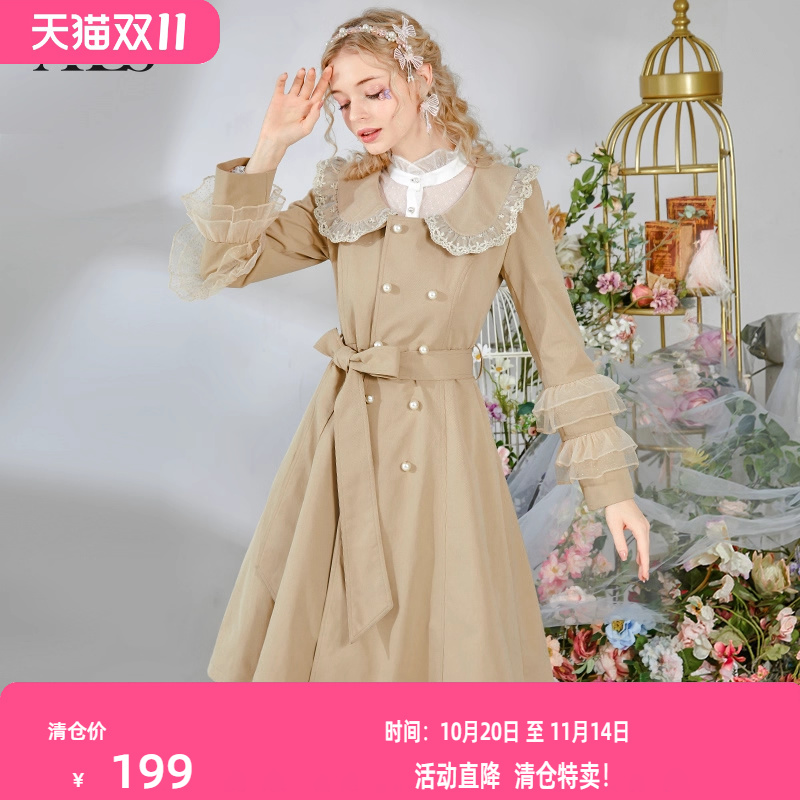 艾丽丝2025秋冬新款卡其色娃娃领双排扣绑带显瘦中长款风衣外套女