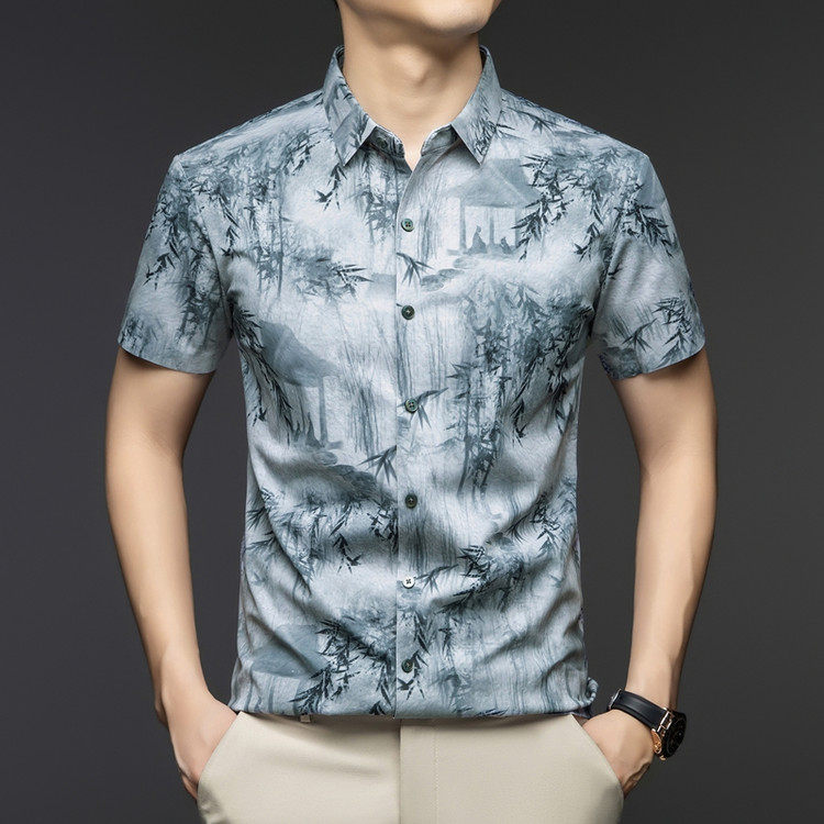 夏季短袖衬衫男父亲装凉感冰丝休闲印花衬衣中年桑蚕丝垂感中国风