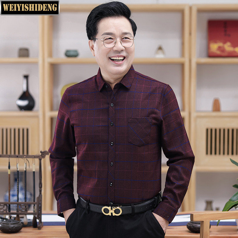 中年爸爸装保暖衬衫男长袖加绒加厚中老年厚实秋冬季大码父亲衬衣