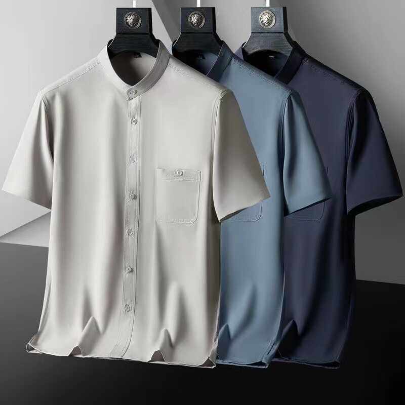 中年男士衬衫夏季中老年人冰丝立领短袖薄款爸爸夏装宽松父亲衣服